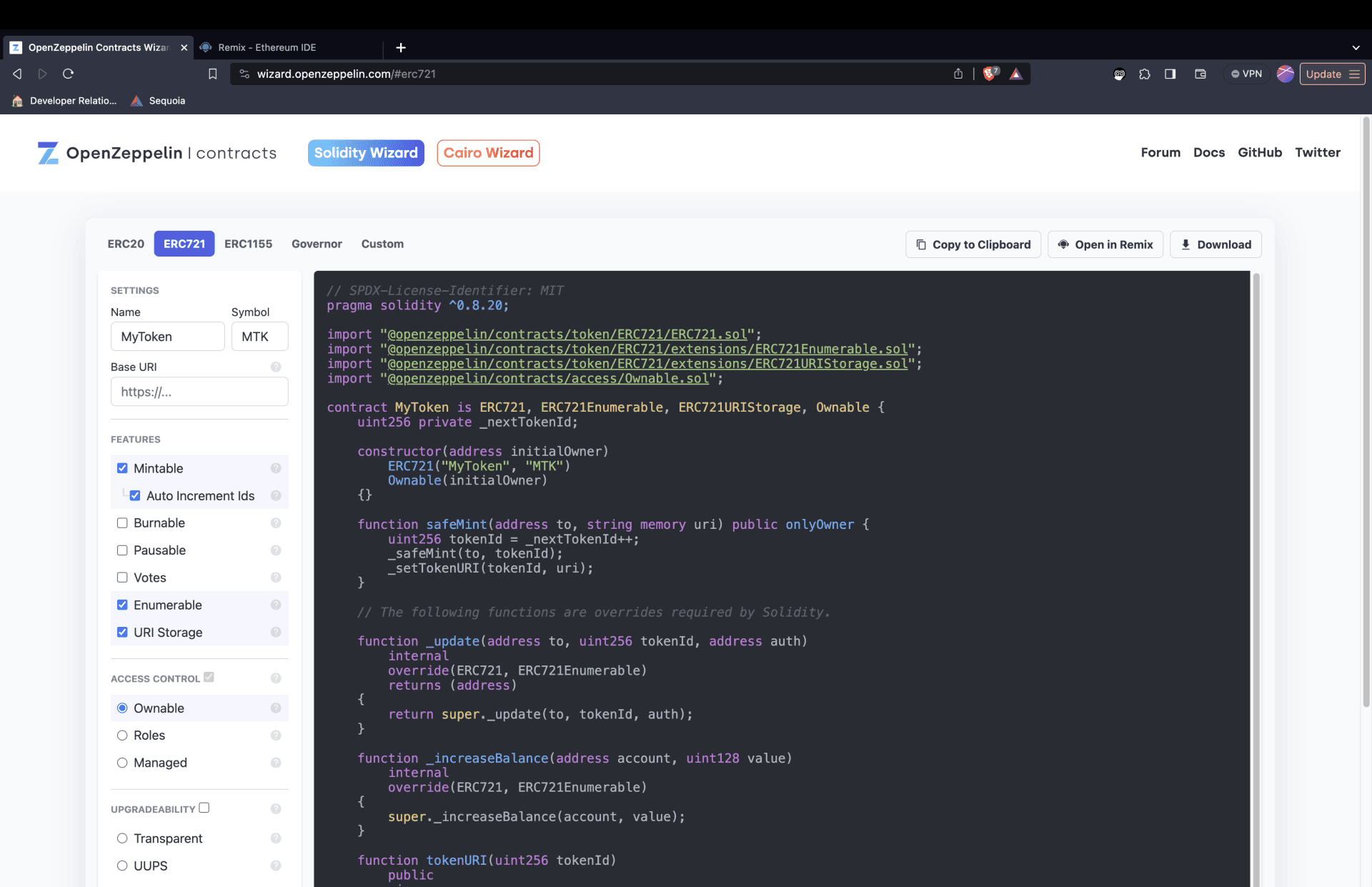We again come across the question of how to deploy a ERC-721 token on the blockchain. Since we have access to the ERC-721 contract interface, there is nothing stopping us from writing our own implementation of an ERC-721 token. However, if you recall the deployment section of the ERC-20 chapter, then you know that we were able to use OpenZeppelin's Contract Wizard to autogenerate our own ERC-20 contract. Likewise, OpenZeppelin's Contract Wizard also allows to create ERC-721 tokens on the fly. For the rest of this section, we will look at just that!